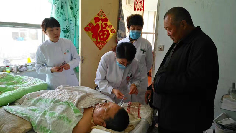 义诊活动过后,又走访了几户困难家庭。其中,这个家庭给我印象最深刻:女主人曾先后三次出现不同程度的脑出血,现已瘫痪在床,处于植物人状态,身体携有气管插管、胃管及导尿管。由于家庭贫困未能接受住院正规治疗护理,医护人员随即正规操作给患者更换了胃管,护理了气管插管及导尿管,实时帮助患者翻身,并告知家属气管切开、胃管、导尿管、定时翻身预防压疮的护理常识及注意事项,此时的男主人早已热泪盈眶,嘴里不停地说着“谢谢,谢谢”。