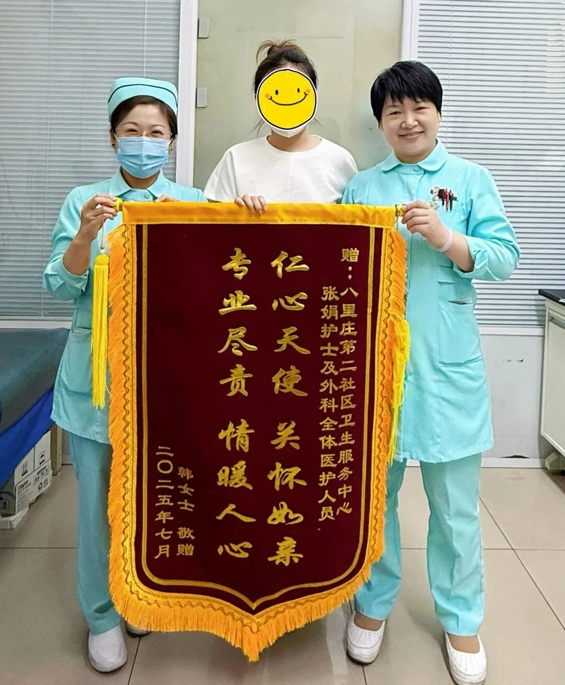 八里庄第二社区卫生服务中心外科护士张娟发现韩女士伤口感染严重,与外科医生主动联系上级专家并协助转诊,避免患者病情加重,“仁心天使关怀如亲,专业尽责情暖人心”道出患者心声。
