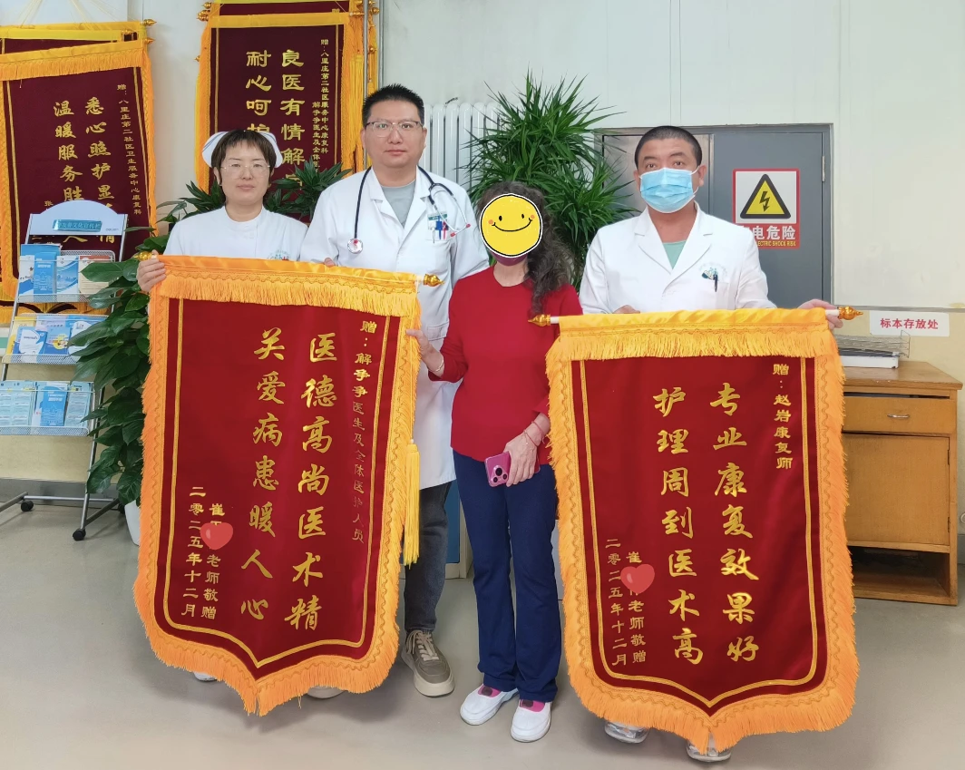 “看到老人重新站起来,我们全家都非常开心!感谢你们用专业和耐心帮助老人重展笑容。”近日,患者王奶奶的家属将两面锦旗分别送到了康复医师解争争和康复师赵岩手中。