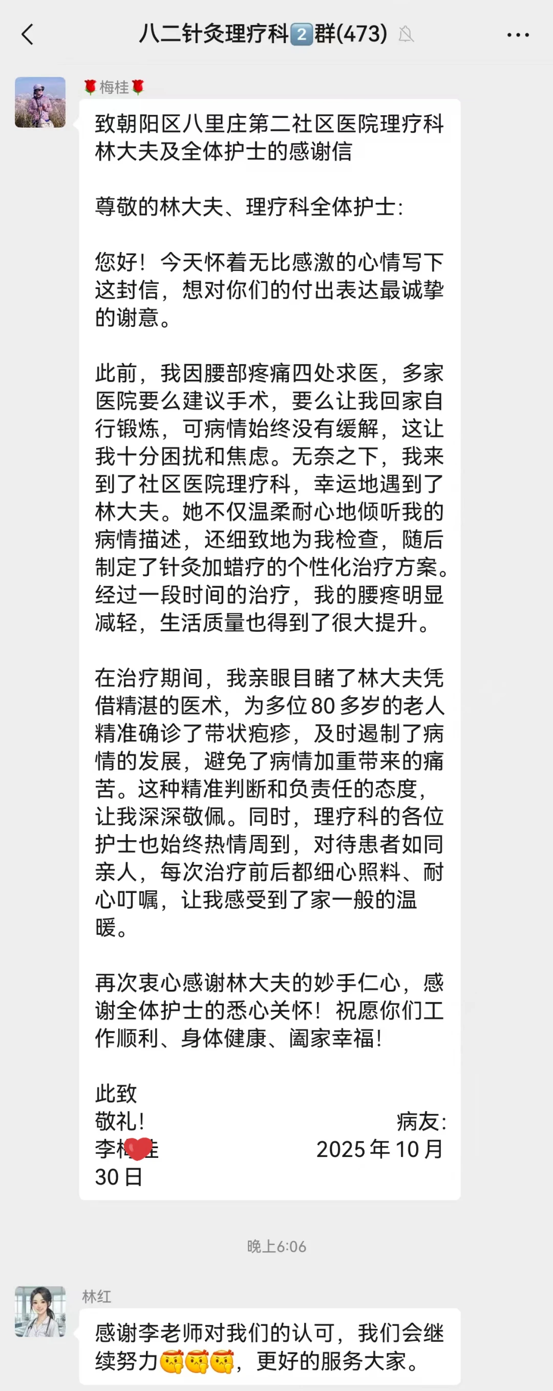 为表达谢意,李女士在患者群写下感谢信,称赞林大夫“妙手仁心”,也感谢针灸理疗科医务人员的贴心照料。这封感谢信不仅是对医务人员的肯定,更彰显了我中心“以患者为中心”的服务理念,它传递了和谐的医患温情,也激励着全体医务人员继续精进医术、优化服务,为守护居民健康而不懈努力。